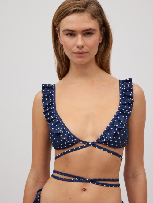 Top bikini triángulo con copa B. Anudado a la espalda y con relleno extraíble. Estampado de lunares con fondo floral.
